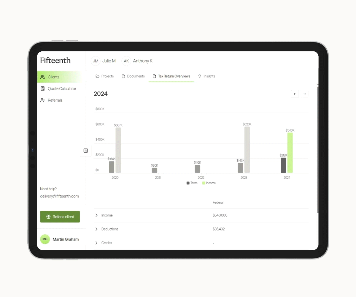 "I don’t have the time and energy to optimize my entire tax picture with options, RSUs, and AMT carryforwards. The Fifteenth team are truly experts at building tax strategies for equity comp. "